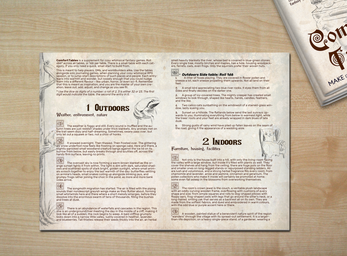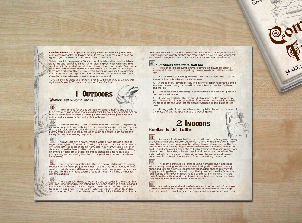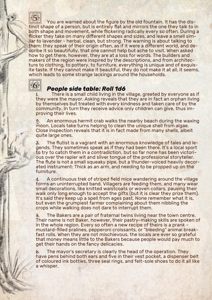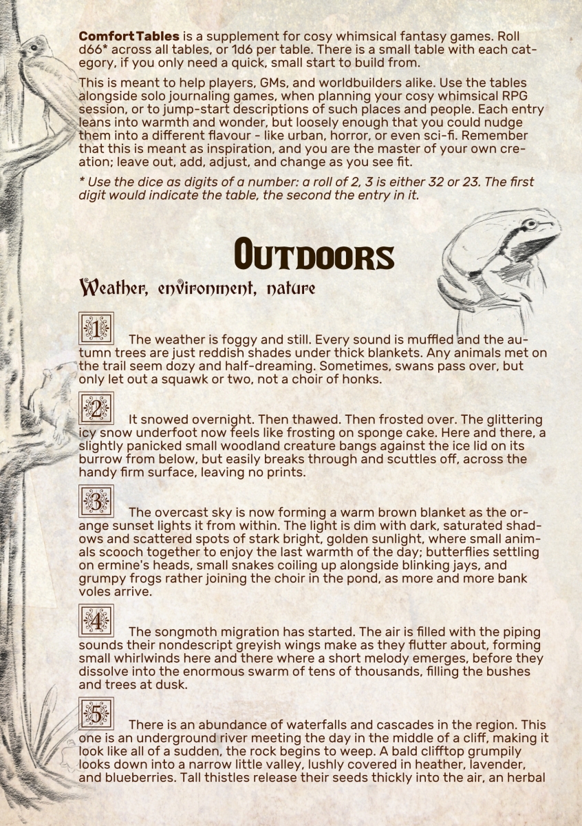 A supplement for cosy whimsical fantasy games. Roll d66 across all tables, or 1d6 per table. This is meant to help players, GMs, and worldbuilders alike. Use them alongside solo journaling games, to plan your cosy whimsical RPG session, or jumpstart descriptions of such places and people. Each entry leans into warmth and wonder, but loosely enough that you could nudge them into a different flavour - like urban, horror, or even sci-fi. Remember that this is meant as inspiration, and you are the master of your own creation; leave out, add, adjust, change as you see fit.