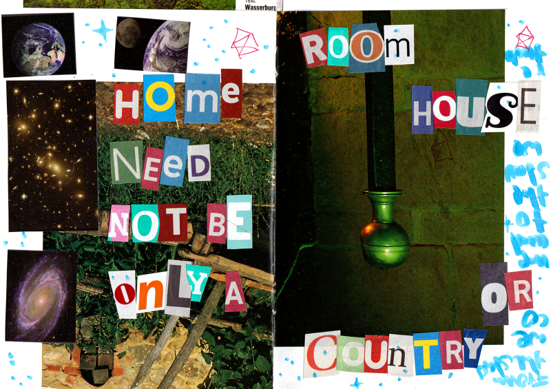 When the Sunday Zine Club's monthly theme was announced to be "home", I thought about making an illustrated zine about my home. But it felt too invasive, it's nobody's business how I live. Instead, I collaged a bunch of stone-aged maps, and cats and snails and quotes the way I like to do for many zines, collecting all kinds of thoughts I had about the subject. And here you go, twelve pages made from photo pages out of a travel coffee table book, about Tuscany, I think. The cover is half of an old acrylic sketch I eventually turned into a Month of Love submission way back when the challenge still ran. Enjoy!