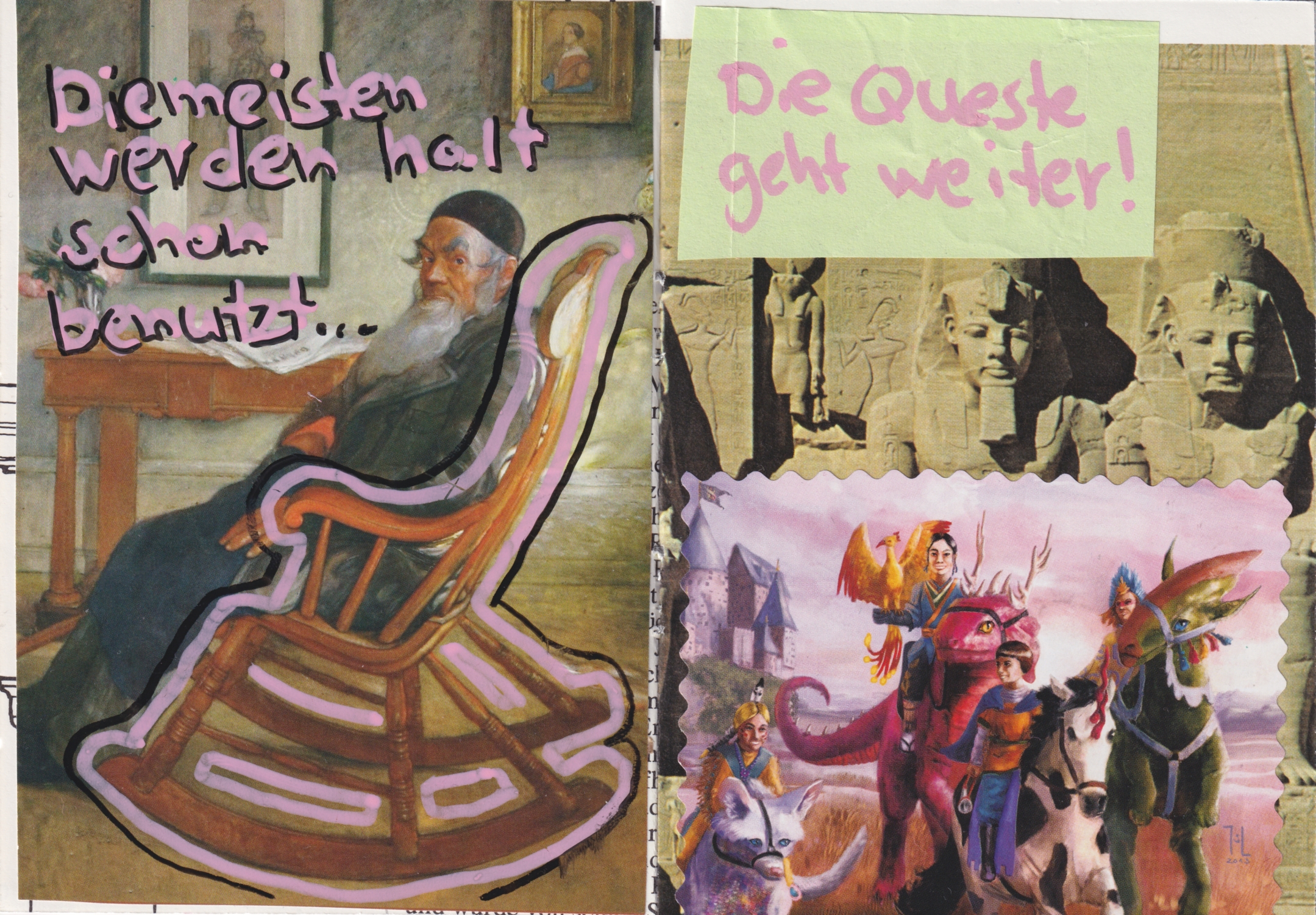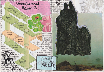 Benutzt Schnipsel aus Werbekatalogen, Acrylmarker und Tuschestifte auf einem Booklet aus einem Architekturbuch aus den Siebzigern. Auf dem Cover natürlich mein Aussteller-Armband vom Con.