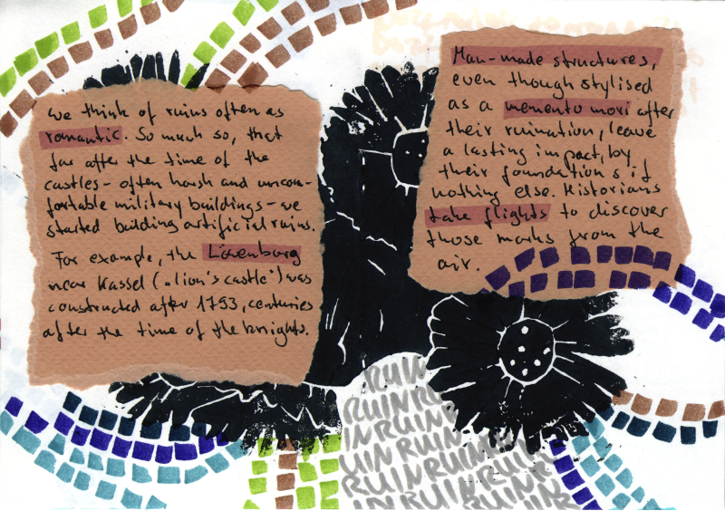 A small zine in booklet form, 12 pages of collage (architecture books from the seventies and some of my very first linoprints) on the buildings left from ages past, how they were used and destroyed, how we feel about them and what we misunderstood about them. Plus a small list of UNESCO World heritage sites you may never have heard of.
