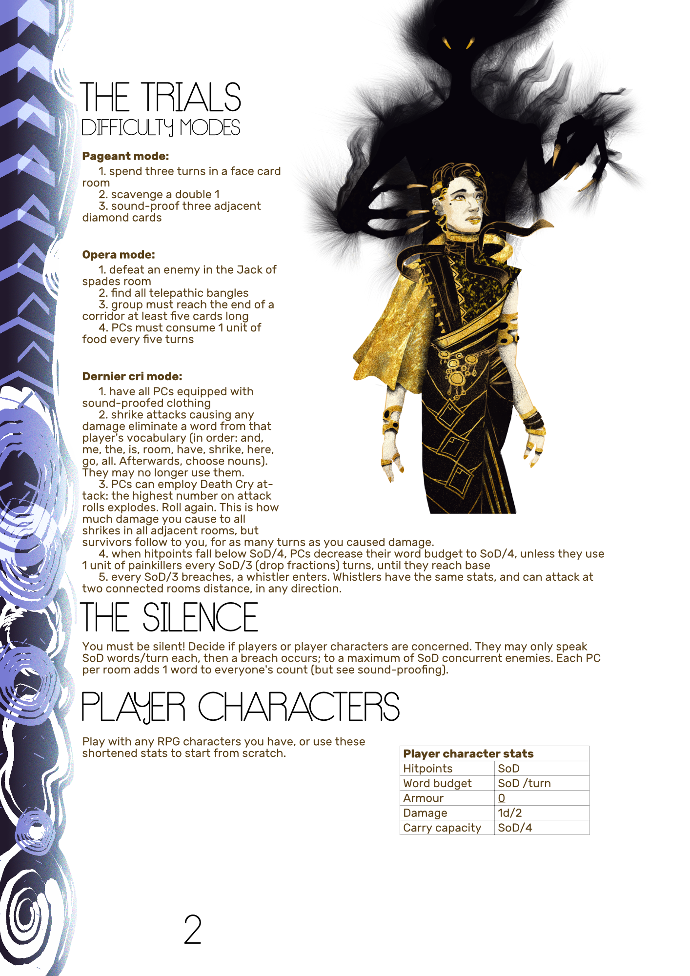Your group has found a way into the gilded halls of the Shrikes. These bodiless creatures were born from the nightmares of humanity, when the doors to Hell were opened on Mars. Shrikes home in on sounds, especially speech. The terrible, beautiful halls of marble, gold, and velvet contain the knowledge to construct the ether-harmonic laser prototype required to defeat them once and for all, and save humanity and its voice...